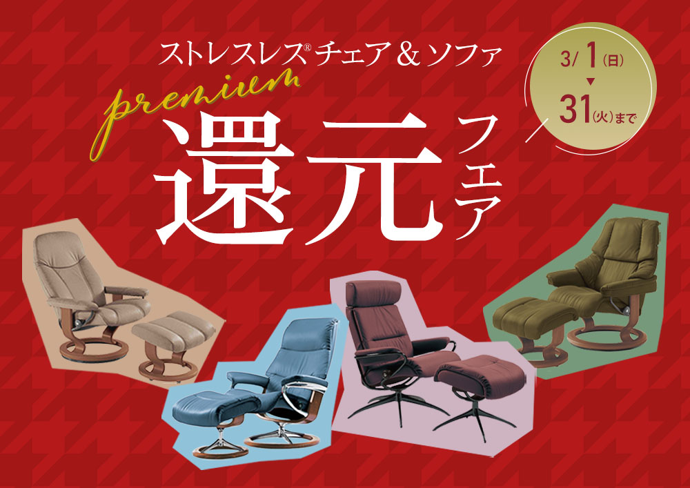3月1日~3月31日の期間限定、「ストレスレス®チェア&ソファ プレミアム還元フェア」を開催します。